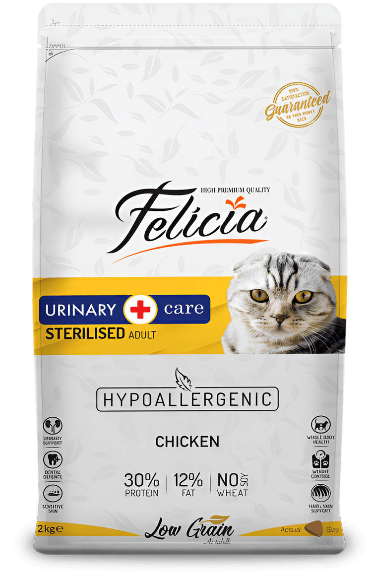 Felicia Sterilised Chicken is specially formulated for adult and sterilized cats over +7 years of age. It helps cats, which are sensitive after sterilization and have a tendency to eat, to prevent excessive weight gain and stone formation. It contributes to urinary tract and kidney health with cranberry fruit and optimum mineral levels. With the support of taurin in its content, it raises living standards by maintaining the vital function of our adults and over +7 years old. Specially designed food grains help reduce the formation of plaque and tartar, while contributing to the formation of vivid, silky and bright hair along with natural Omega 3 & 6 fatty acids. All Felicia formulas provide our friends with the highest quality content and a healthy and balanced diet to ensure optimum nutrition.