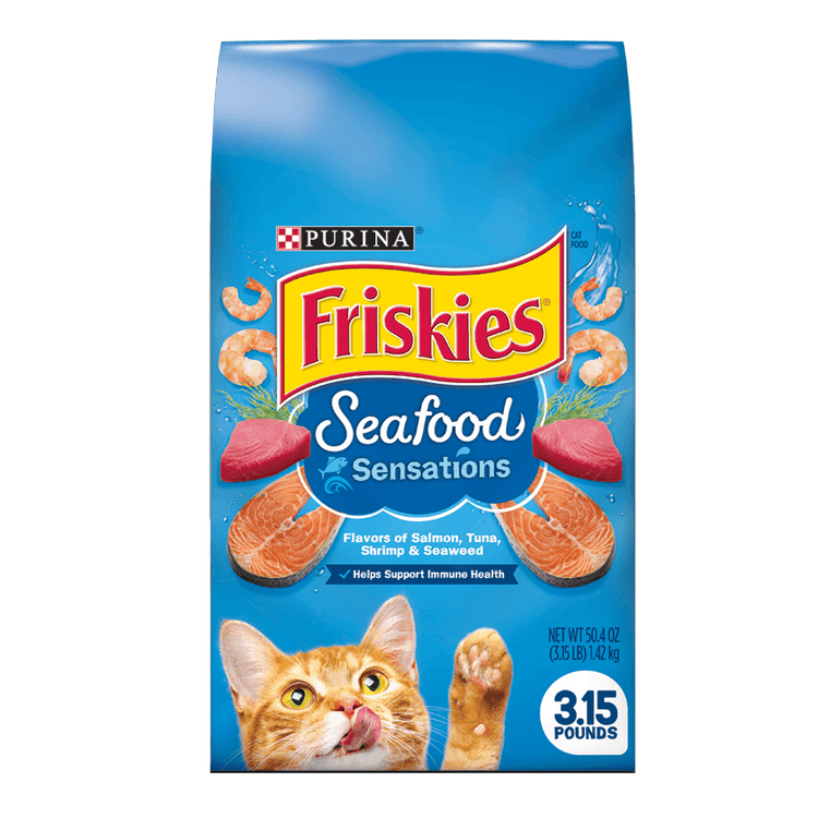 Seafood-lovin’ cats love this mix of flavors of salmon, tuna, shrimp & seaweed. RECOMMENDED DAILY FEEDING AMOUNTS Using a standard 8 oz measuring cup These amounts are averages and your cat’s needs may differ. So feeding should be adjusted as necessary to maintain an ideal body condition. Want some variety? Serve it up by feeding your cat Purina Friskies canned in addition to or mixed with Purina Friskies dry. Remember, cats are nibblers who enjoy eating small meals throughout the day, so your cat would appreciate it if you keep a bowl of Purina Friskies dry cat food available at all times. Keep in mind, pregnant and nursing cats may require 2 - 4 times their normal feeding. LUCKY ENOUGH TO HAVE A KITTEN? Kittens generally nibble solid food at 3 - 4 weeks of age. Keep moistened Purina Friskies available to these kittens at all times. After weaning (at 6 - 8 weeks of age), kittens will normally eat dry or moistened food at will. If water is added, use no more than one part warm (not hot) liquid to three parts Purina Friskies, changing frequently to ensure freshness. CURIOUS ABOUT OTHER FRISKIES FLAVORS? Remember, changes in your cat’s diet should be made gradually to allow your cat to become accustomed to a new food. Substitute small amounts of the new food for the old food, gradually increasing the amount of the new food while decreasing the old food, over a period of 7 - 10 days. This gradual transition will help avoid dietary upsets—something both you and your cat can appreciate. Provide adequate fresh water in a clean container daily. For your pet’s health, see your veterinarian regularly.