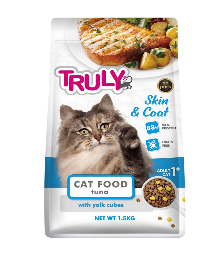 Truly Skin & Coat Adult Cat Food in Tuna with Yolk Cubes 1.5kg Details: Real tuna packed with high-quality protein for overall health. Natural, no artificial additives, colors, or preservatives. Rigorous testing ensures safety and meets high standards. Delightful aroma and taste for a satisfying meal. Ingredients responsibly acquired, promoting environmental health. Easy to serve pouches keep food fresh for longer. Trusted for complete and balanced nutrition. 88%meat protein and grain free.